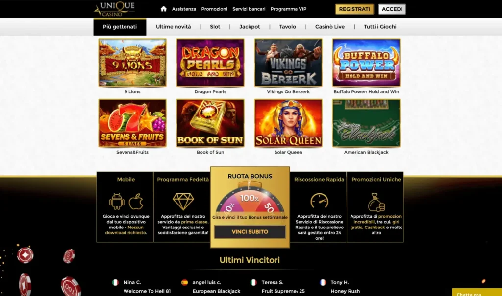 Cosa rende l’app Unique Casino unica nel panorama affollato dei casinò mobile? Offre oltre 1100 giochi, da slot classiche a live dealer, con un’interfaccia fluida che si adatta a ogni schermo. I bonus iniziali, come il 100% sul primo deposito fino a 200€ più giri gratuiti, attirano sia principianti che veterani. E se ti preoccupa la sicurezza? La piattaforma usa crittografia SSL avanzata, proteggendo i tuoi dati come una cassaforte digitale.